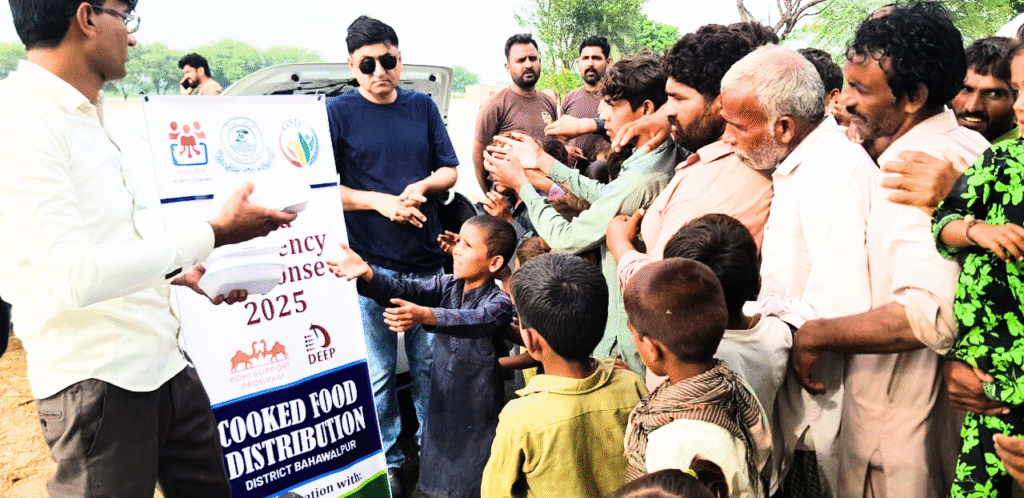 On September 7, 2025, Asara for Humanity Network and Rohi Support Program, in collaboration with the Department of Social Welfare Bahawalpur, launched a critical relief operation in Abbaspur. Cooked meals were distributed to 100 families, providing immediate respite to those grappling with hunger. Fodder was also provided to support livestock, a lifeline for many in this agrarian region.